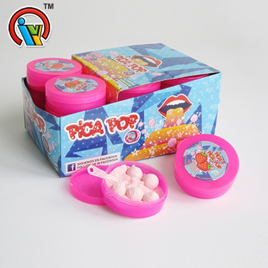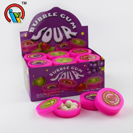 هذا المنتج الذي دعا فقاعة العلكة مع مسحوق الحلوى أنها تحظى بشعبية مع العملاء. هذا مربع جميل يحتوي على شكل الكرة مضغ العلكة و مسحوق الحلوى. وهناك نكهة التفاح، نكهة العنب، نكهة الفراولة وغيرها من النكهات لاختيارك. للطعم، وسوف تشعر مسحوق المضغ من العلكة فقاعة وحموضة من مسحوق الحلوى يكفي لجعل لكم تذكر هذا المنتج.